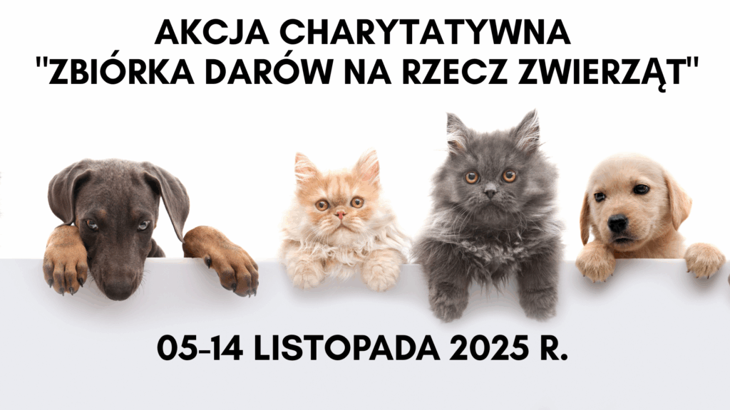 W dniach 05-14 listopada 2025 r. w naszej szkole odbędzie się ZBIÓRKA DARÓW NA RZECZ ZWIERZĄT. Zapraszamy społeczność naszej szkoły do przyłączenia się do akcji. W tym roku zbieramy dary dla stowarzyszenia „MY DLA ZWIERZĄT” działającego na terenie Włodawy i okolic.