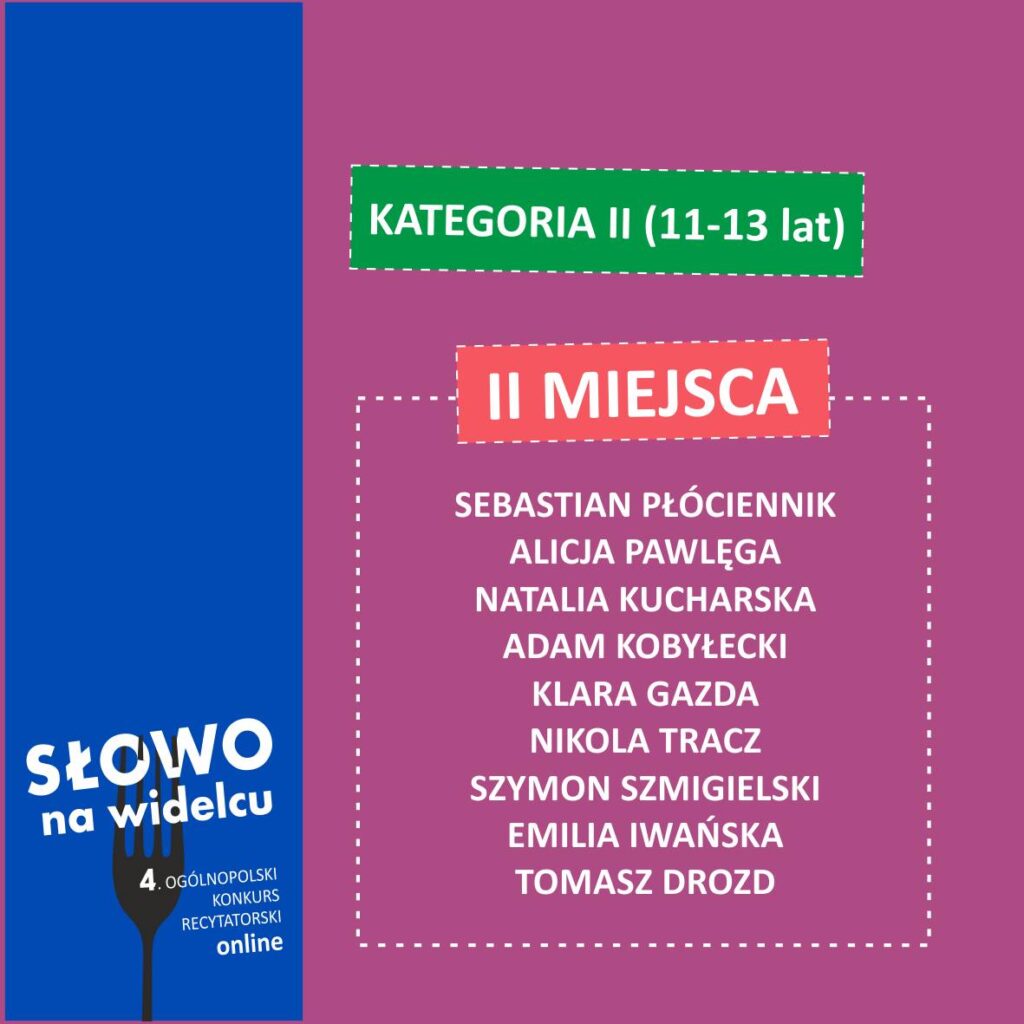 Tomek Drozd z kl.5 d zajął II miejsce w 4. Ogólnopolskim Konkursie Recytatorskim „Słowo na widelcu” online. Został nagrodzony za fragment prozy „Rozmowy ze świnką Halinką”, roz. „Tata” Roksany Jędrzejewskiej-Wróbel.
