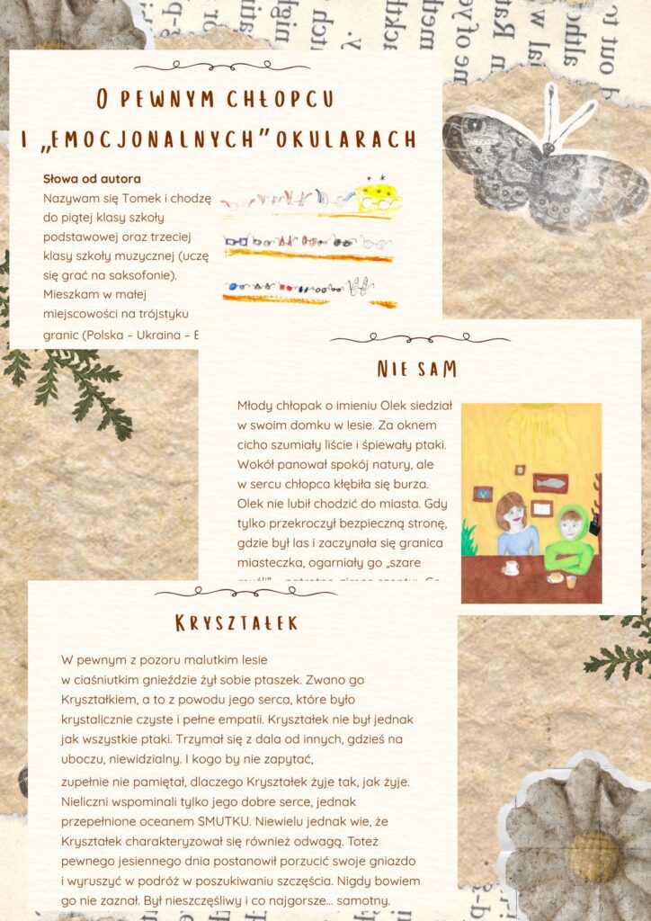 Ania Chudzik z klasy 7b – autorka opowiadania “Nie sam”, Tomasz Drozd z klasy 5d – autor opowiadania “O pewnym chłopcu i „emocjonalnych” okularach” oraz Konstanty Wszendyrówny z klasy 6a – autor opowiadania “Kryształek”, zostali wyróżnieni publikacją swoich prac w e-booku „Dzieci piszą dzieciom”.
