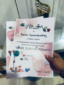 22 maja 2025r. w Dorohusku uczennica klasy 5b Blanka Tomaszewska wyśpiewała I miejsce w Wojewódzkim Konkursie Piosenki Przyrodniczej “Tobie Ziemio Śpiewam” .