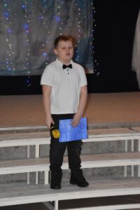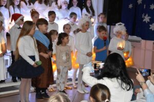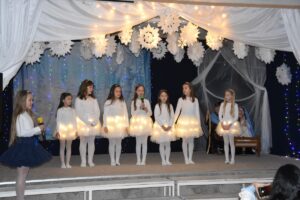 15 grudnia 2025r. odbyło się świąteczne przedstawienie pt. „Światło w płatkach śniegu”, przygotowane przez uczniów klasy 2a i 3c. Było to wyjątkowe wydarzenie, pełne magii, blasku światełek, muzyki i śpiewu. Scenografia nawiązywała do zimowej, bajkowej scenerii, a delikatne światła i dekoracje wprowadzały widzów w świąteczny nastrój.