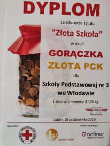 W dniu 25 października 2025 zarząd Lubelskiego Oddziału Okręgowego Czerwonego Krzyża przyznał naszej szkole tytuł ZŁOTEJ SZKOŁY za udział w akcji Gorączka Złota PCK i uzbieranie przez uczniów monet, które ważyły 87,28 kg. Otrzymaliśmy też nagrodę pieniężną w wysokości 300 zł do wykorzystania w salonie Empik. Dziękujemy uczniom za udział w akcji, nauczycielom za zaangażowanie.